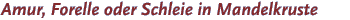 Die Fische/Filets säubern, salzen, pfeffern und mit Zitronensaft beträufeln. Eier im Teller verquirlen, Mehl und Mandelplättchen im Teller vermischen. Die Fische zuerst im Ei dann im Mehlgemisch wenden. Butter in großer Pfanne aufschäumen lassen, die Fische jede Seite ca. 5 min. bei mäßiger Hitze garbräunen. |